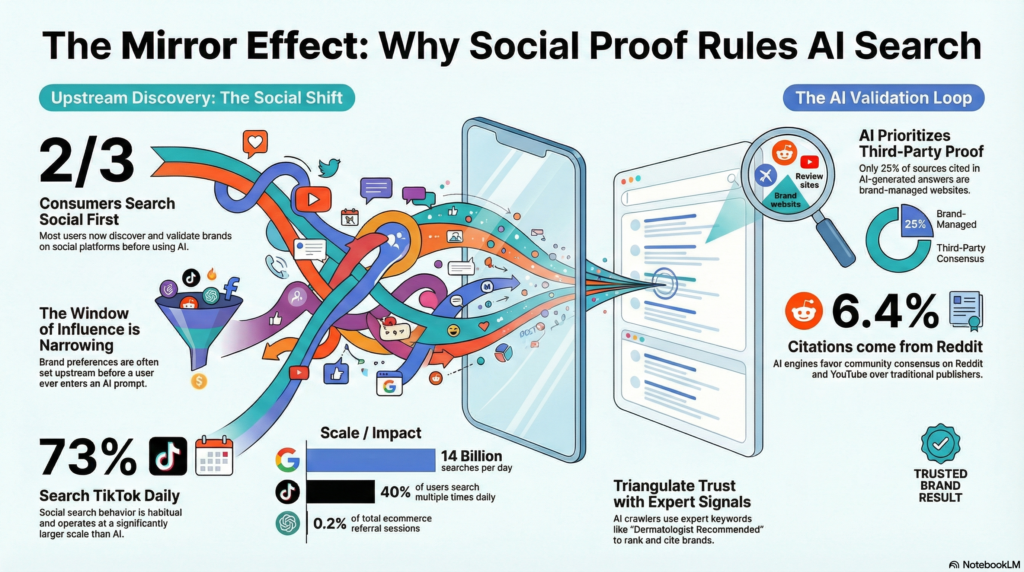 While traditional SEO is still vital, discovery has fragmented. Nearly 40% of users on platforms like TikTok search multiple times a day, and AI models use these social signals to validate the information they provide.